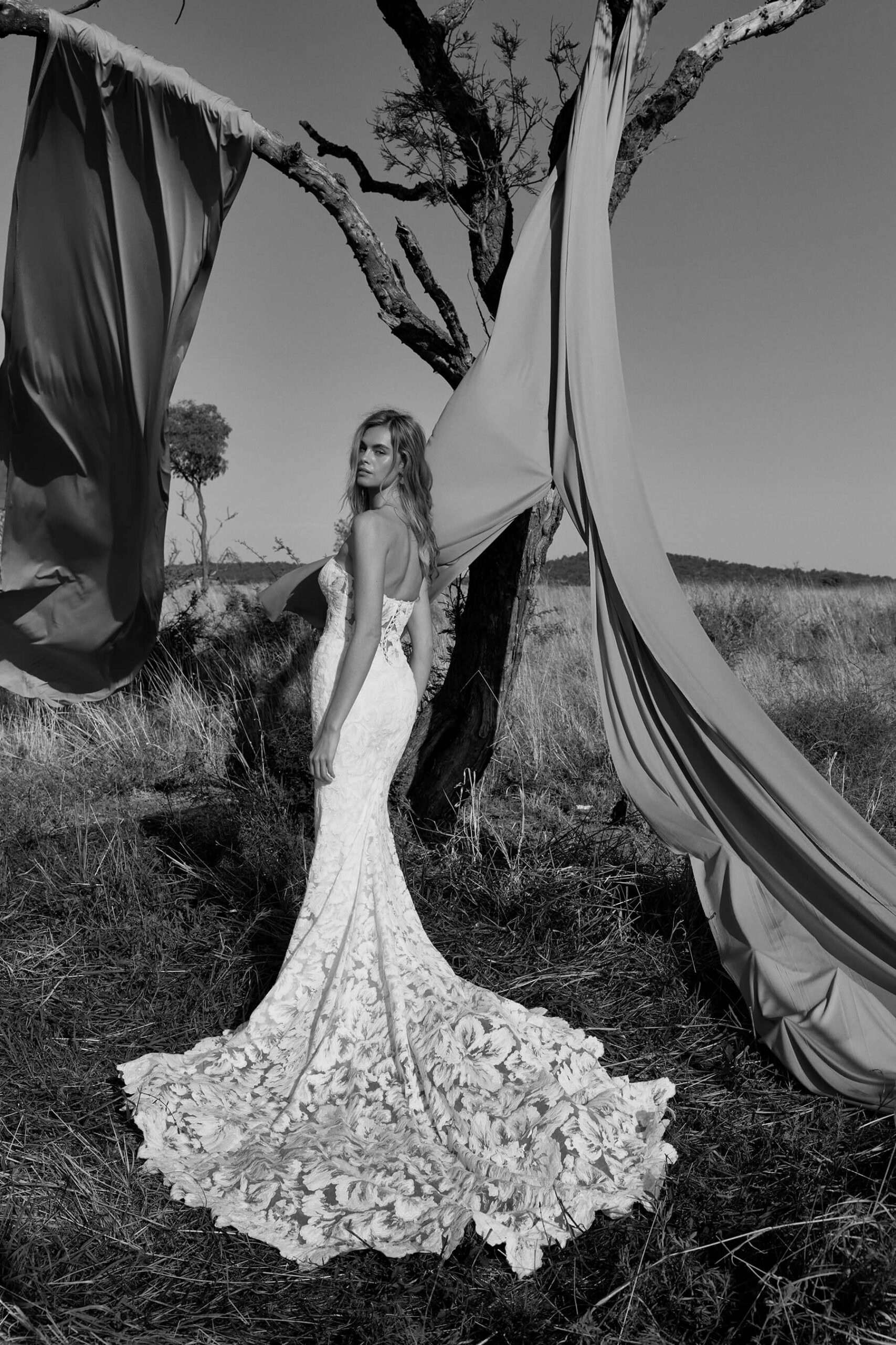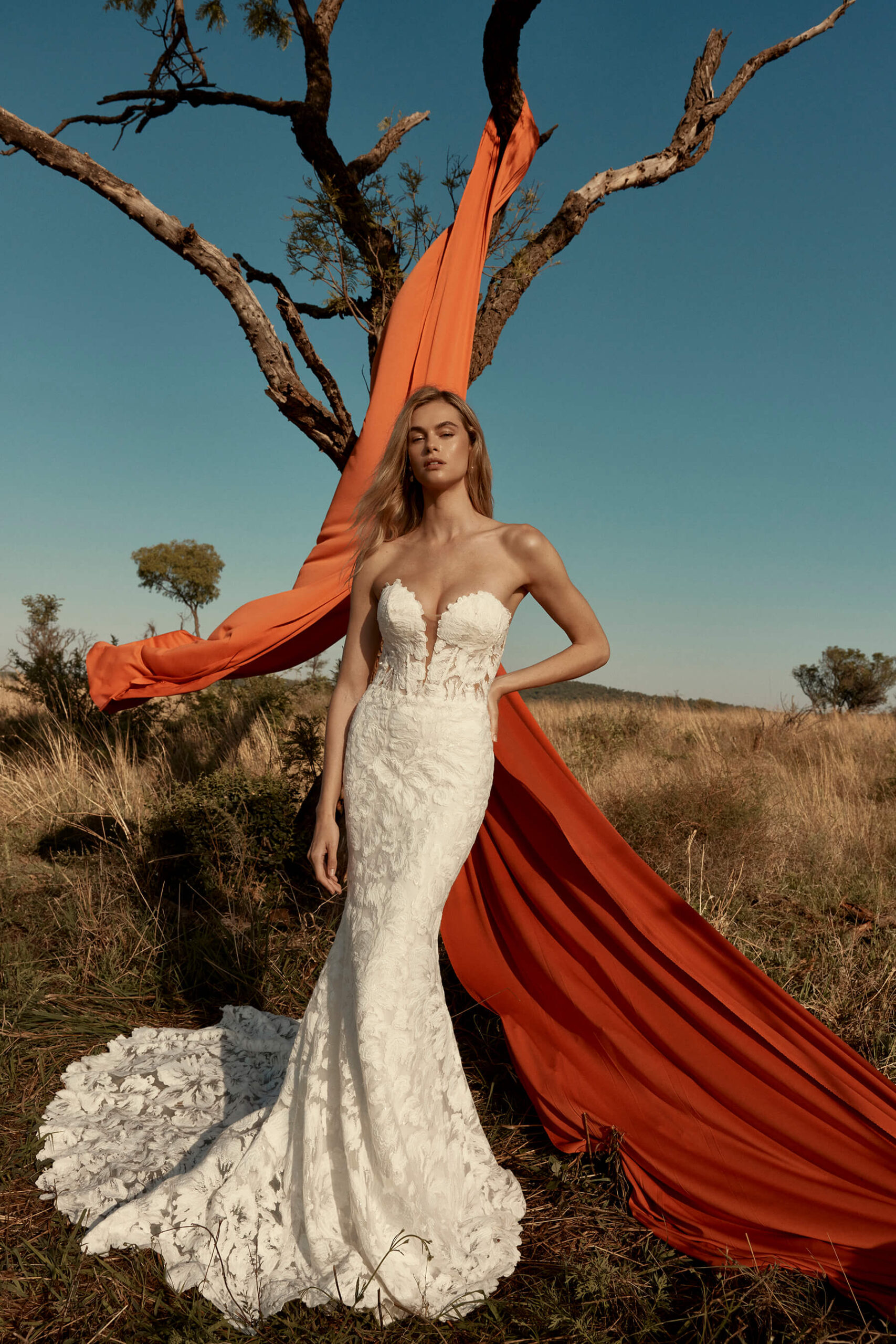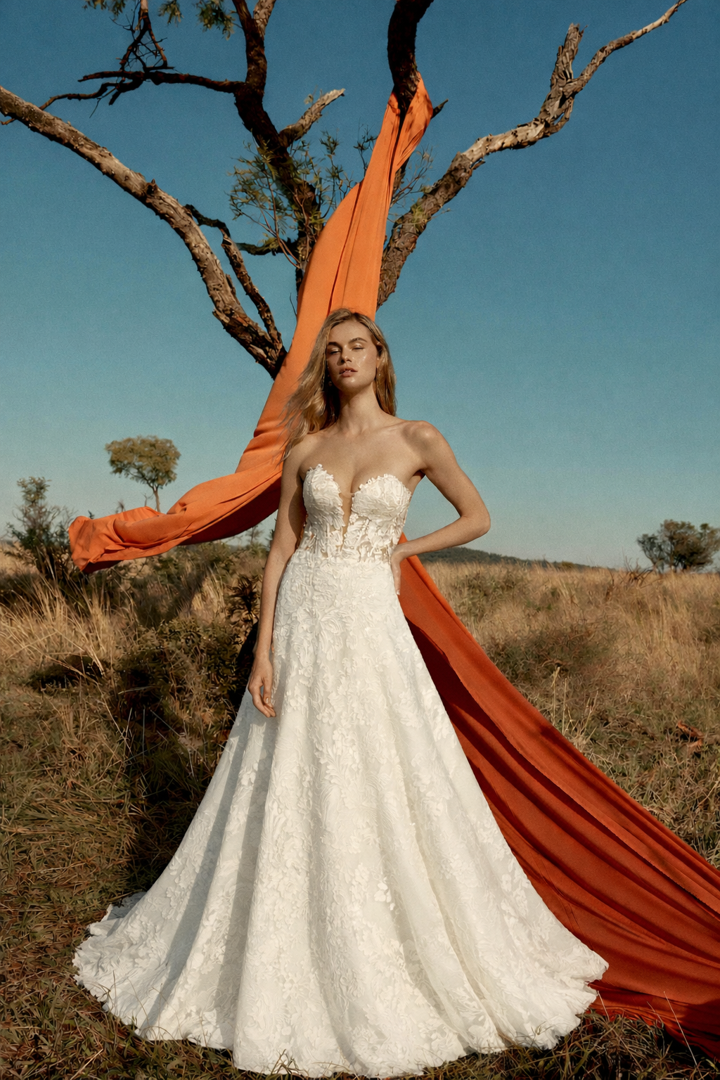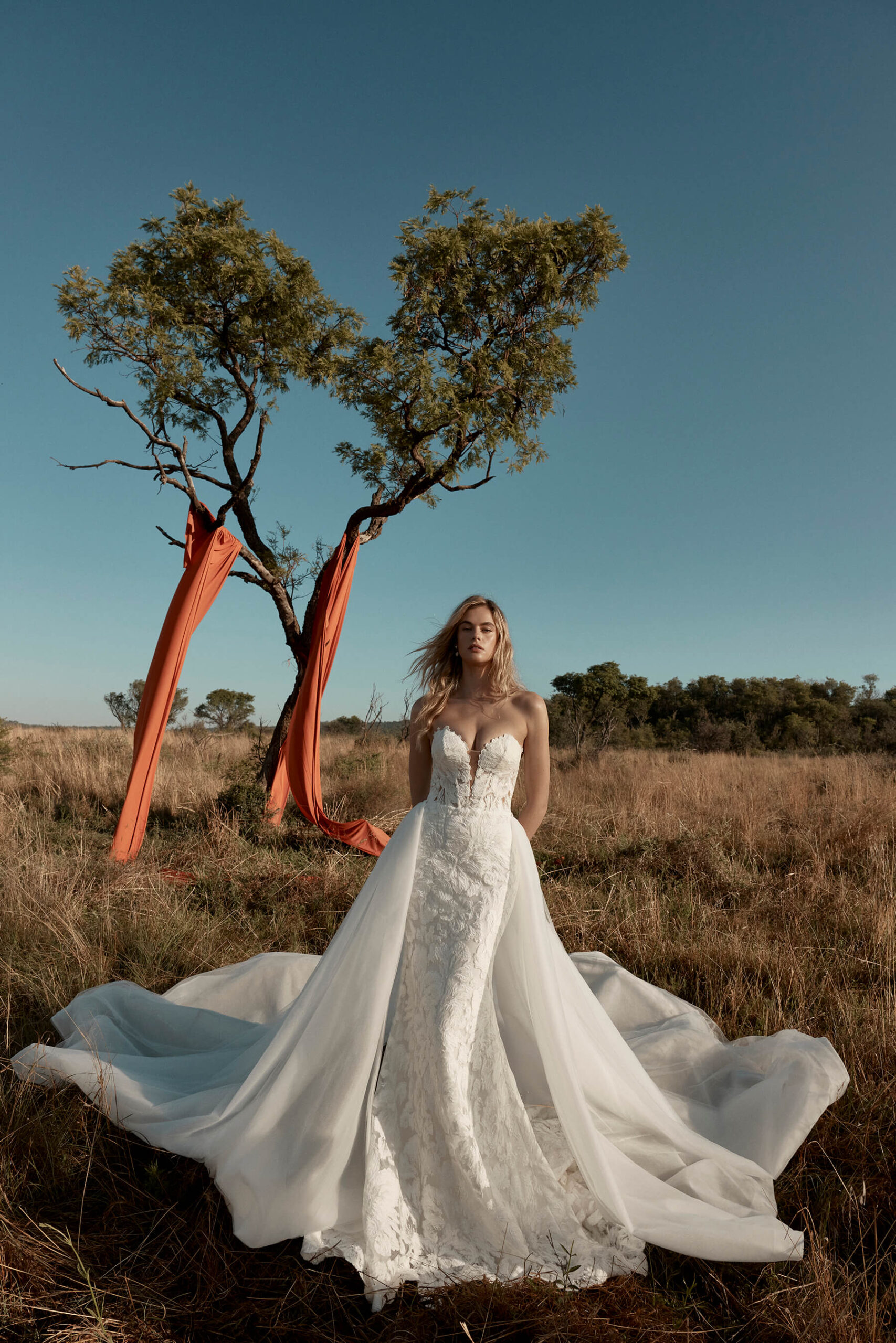 The Amara Gown is a breathtaking lace creation designed to move with effortless grace. A plunging neckline elongates the silhouette, balanced by a dramatic detachable overskirt that adds volume and couture flair. The gown’s exquisite cut-out train hem reveals intricate lace artistry, creating a mesmerizing finish from every angle. Romantic, sculptural, and timeless, Amara embodies elegance that feels both modern and eternal.