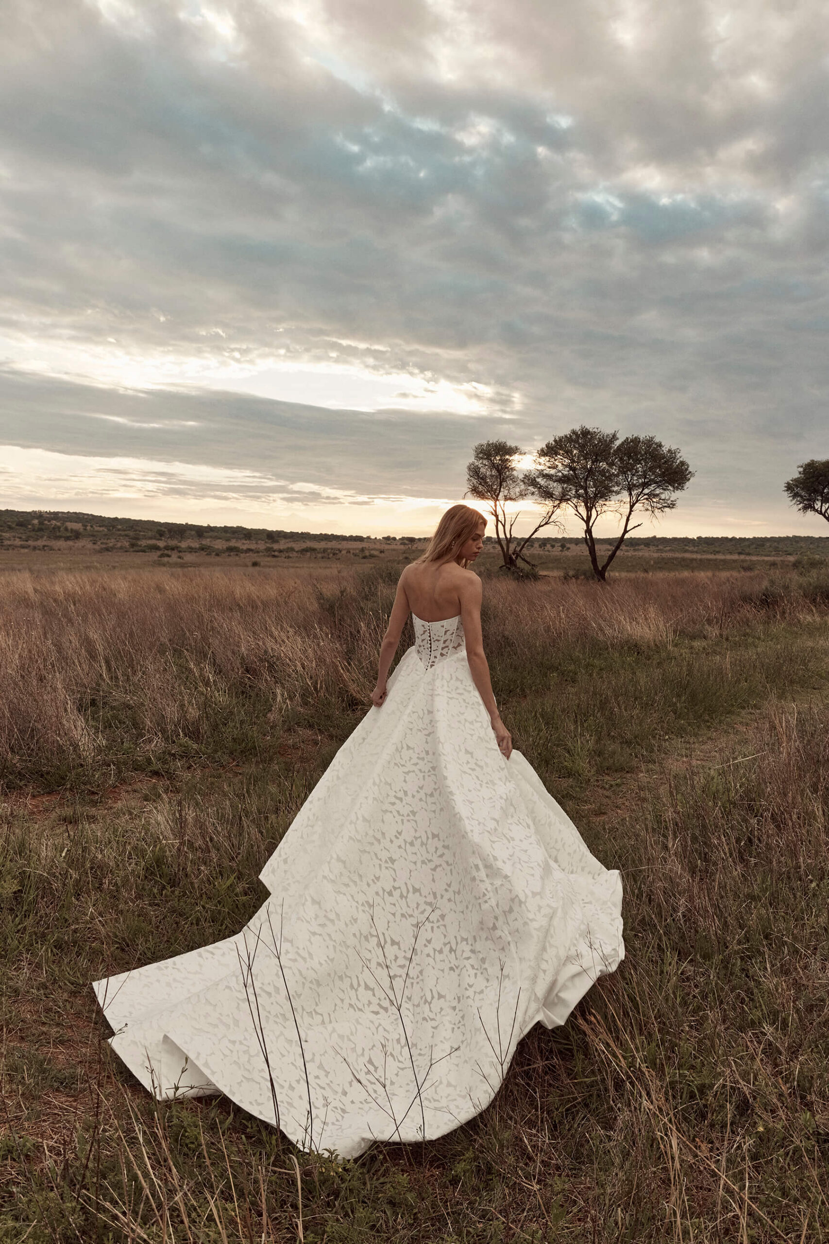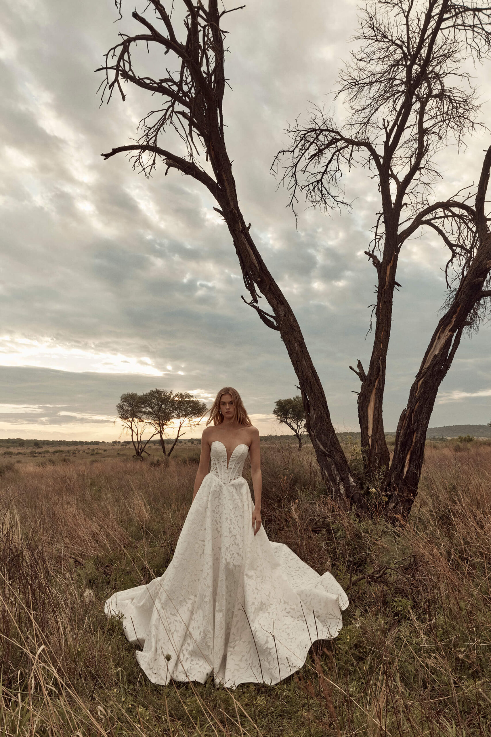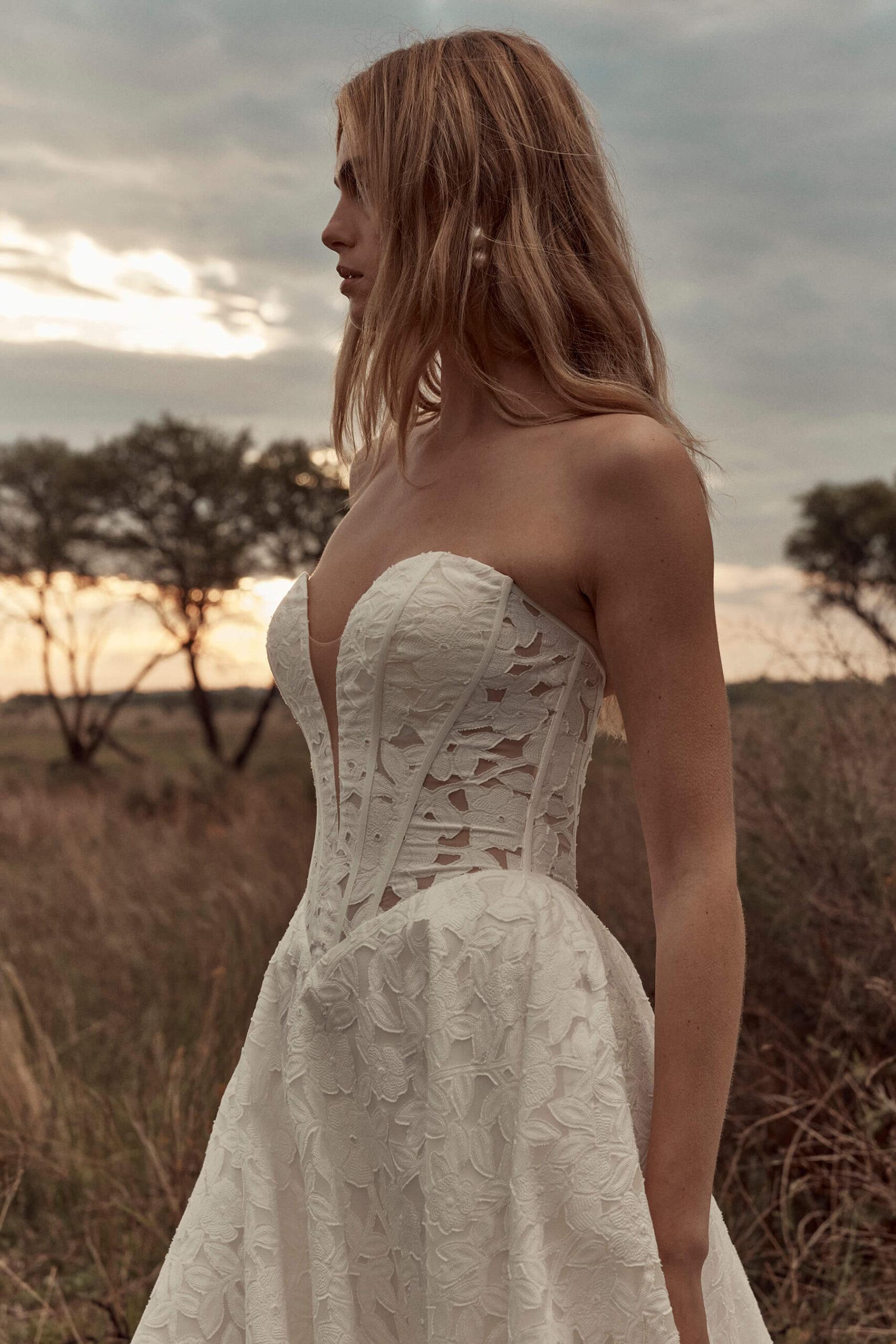 This exquisite gown features a plunging V-neckline with built-in support for impeccable structure and comfort. Crafted in richly embroidered lace, it showcases an elegant A-line , basque waist silhouette that flows into a sweeping train. The bold floral motif adds depth and movement, while the corseted bodice sculpts the waist , a timeless blend of romance, strength, and sophistication.