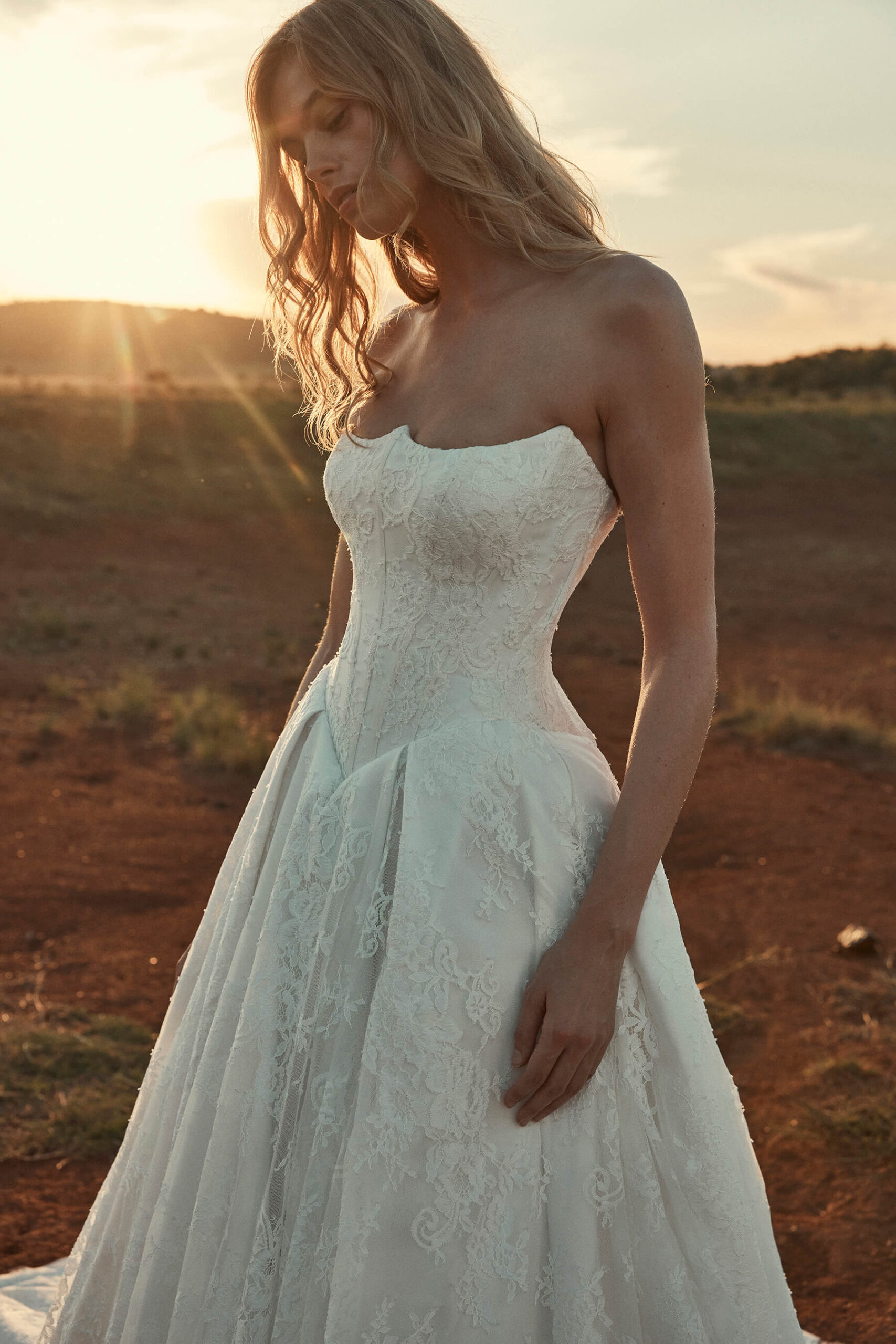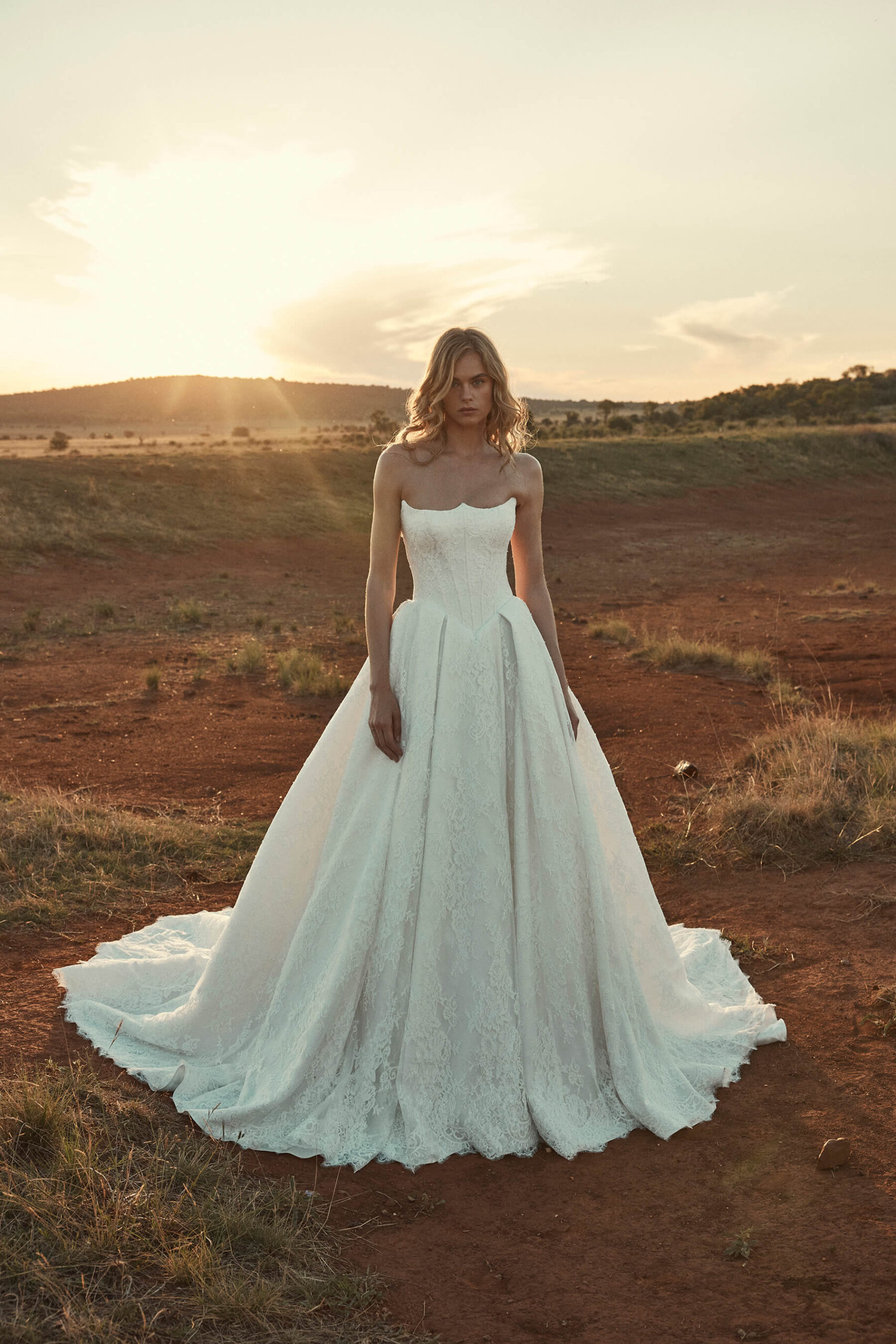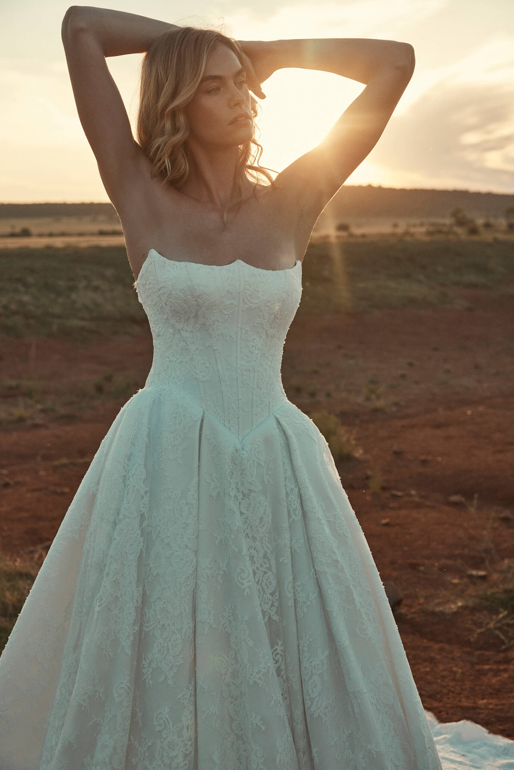 The Eirene Gown is a breathtaking ball gown crafted entirely from intricate lace, radiating timeless elegance. A sculpted sweetheart neckline frames the décolletage, while the basque waist defines and elongates the silhouette with regal precision. The voluminous skirt flows gracefully to the floor, closing at the back with a hidden zip closure for a seamless finish. A modern homage to classic couture, Eirene is a vision of poise, femininity, and eternal grace.