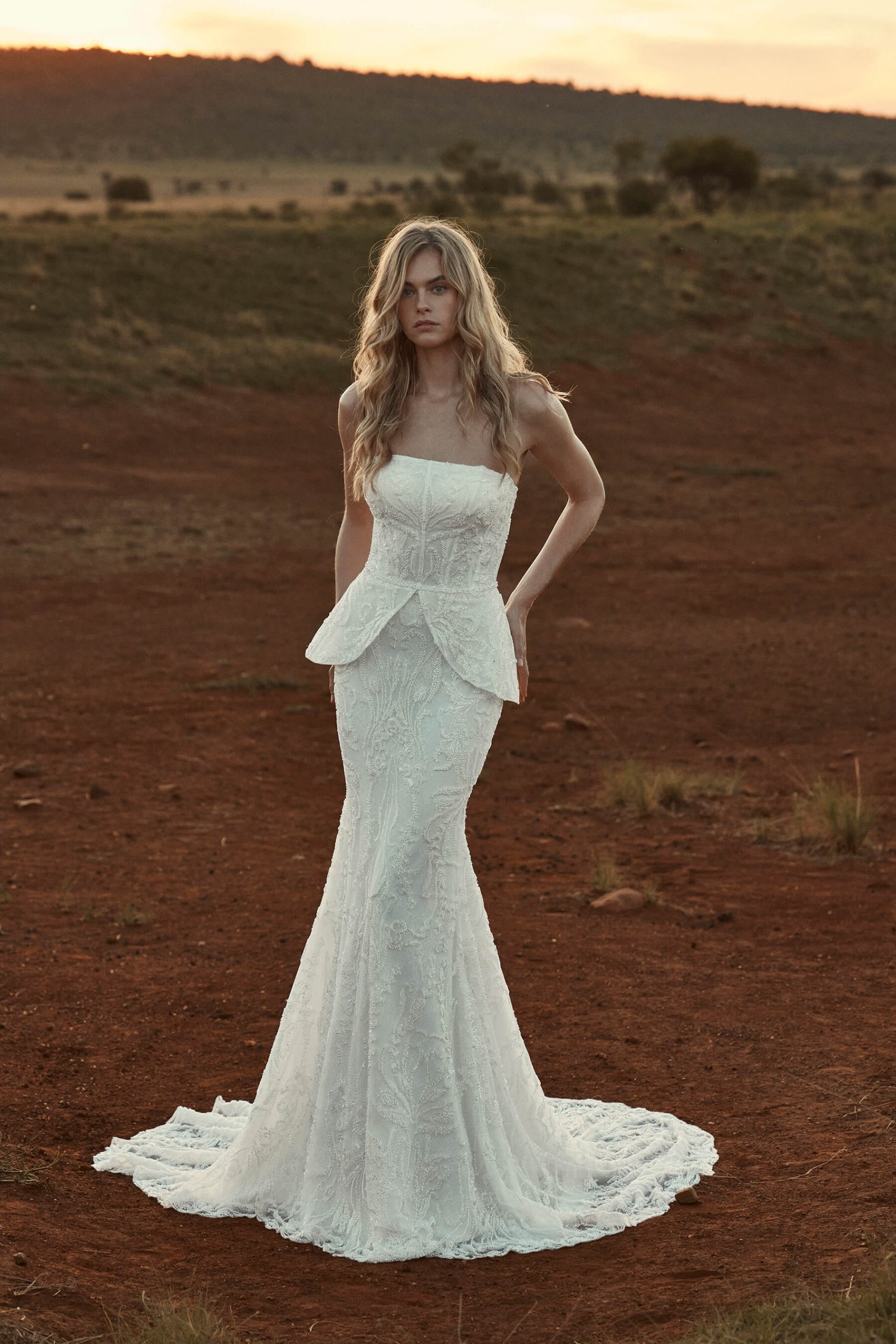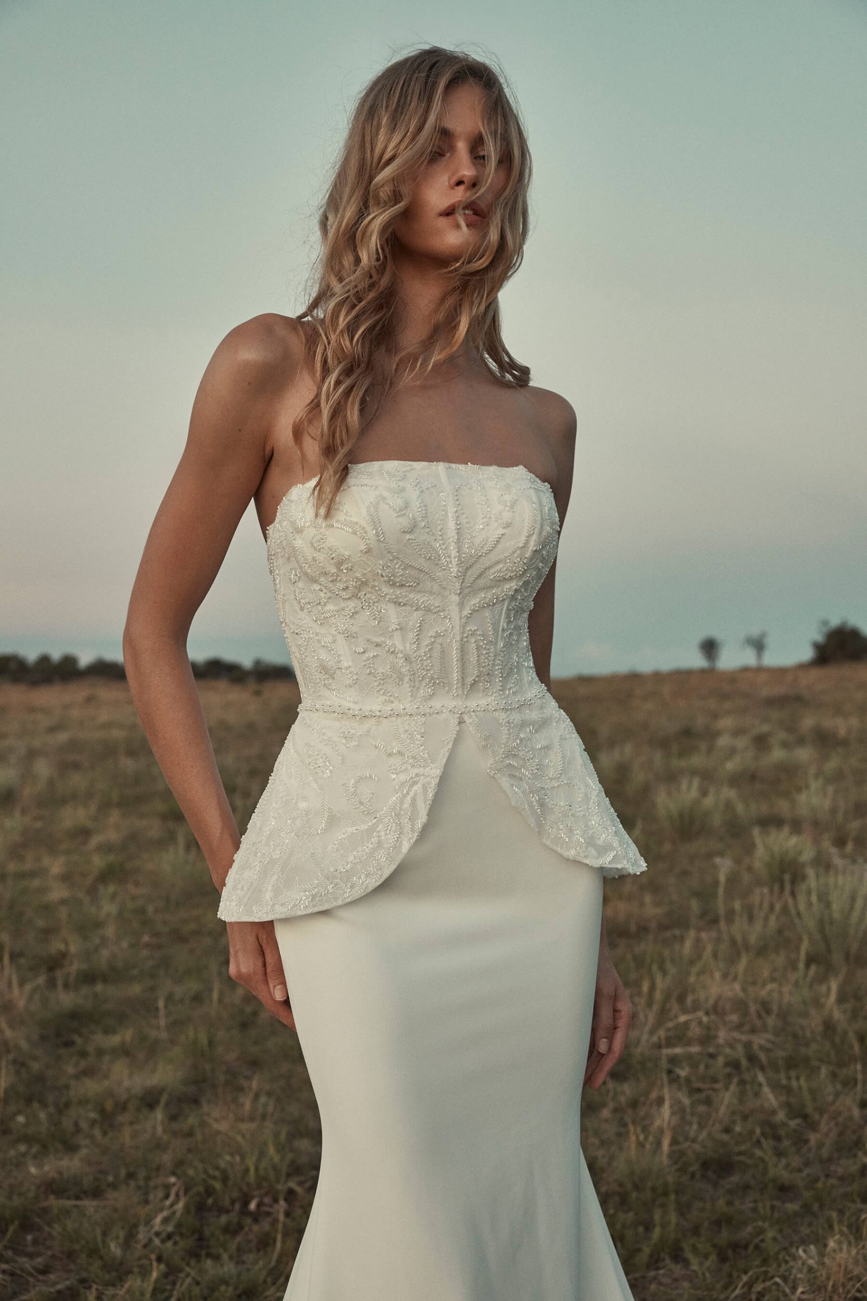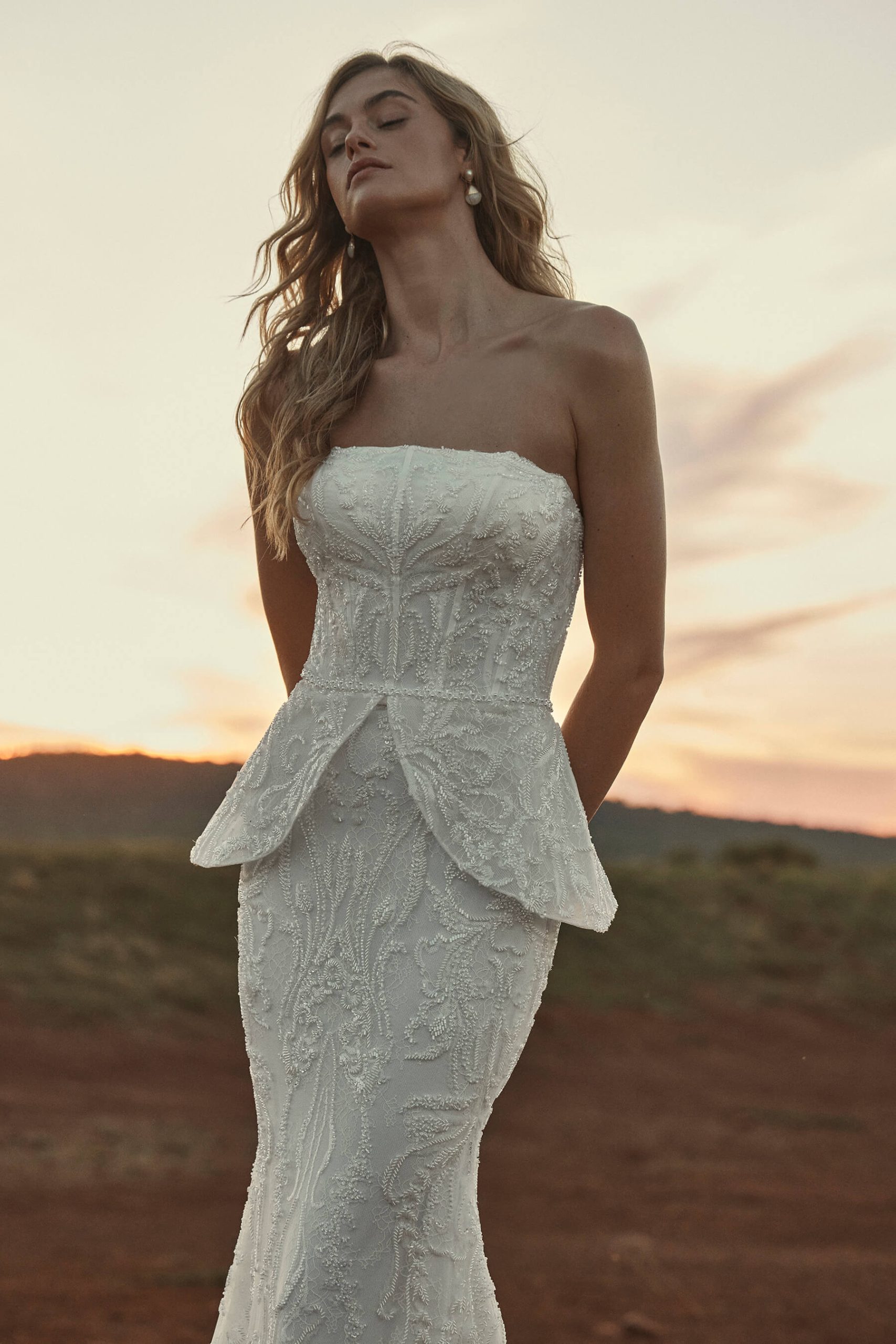 The Iria Gown is a modern two-piece masterpiece in soft ivory embellished lace. Designed with a structured strapless bodice and a graceful peplum overlay, it flatters every curve while adding a touch of architectural drama. Brides can choose between a beaded skirt for luminous texture or a sleek crepe skirt for understated sophistication. Effortlessly versatile, Iria transitions from ceremony to celebration with timeless refinement and ease.