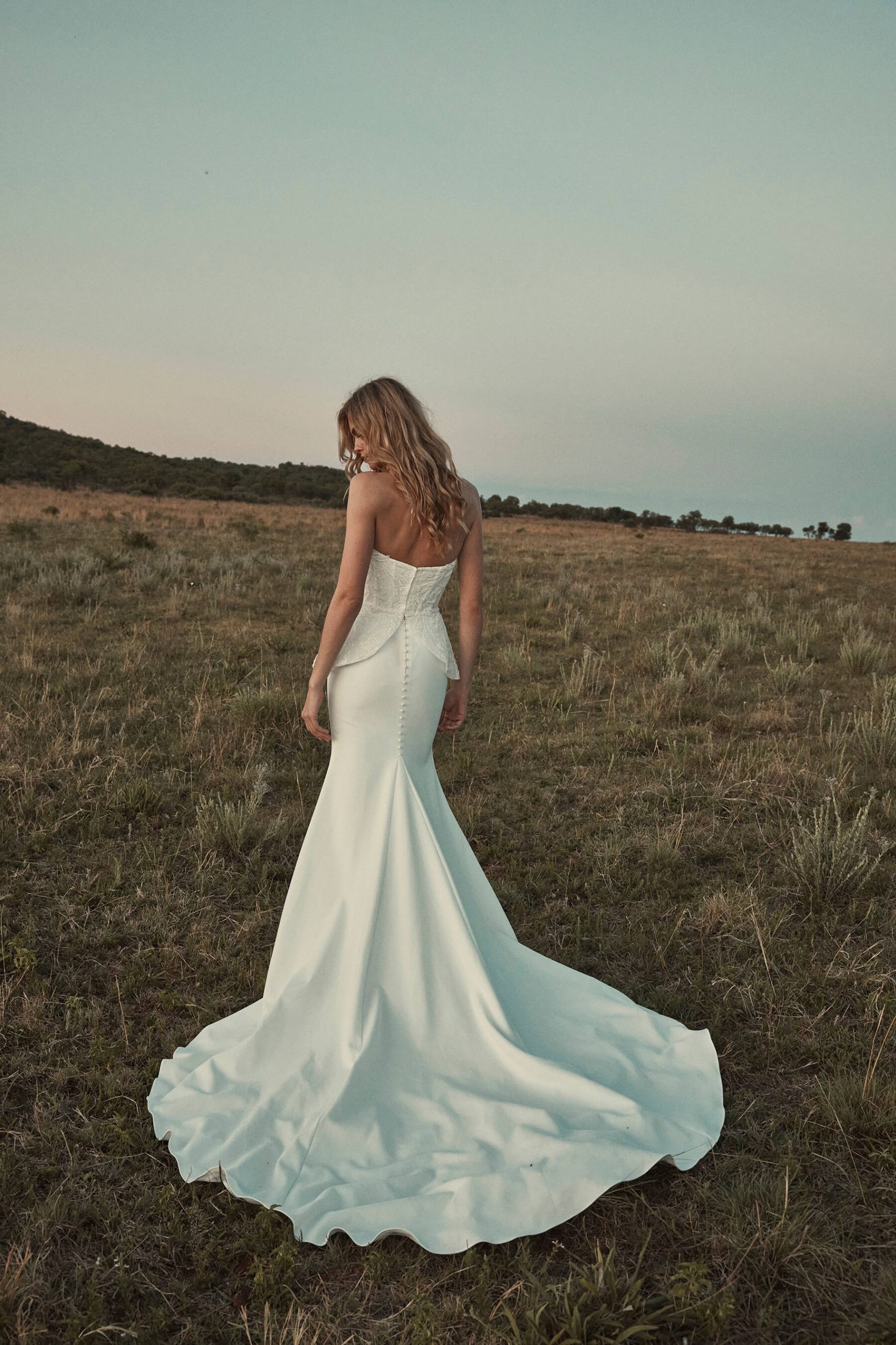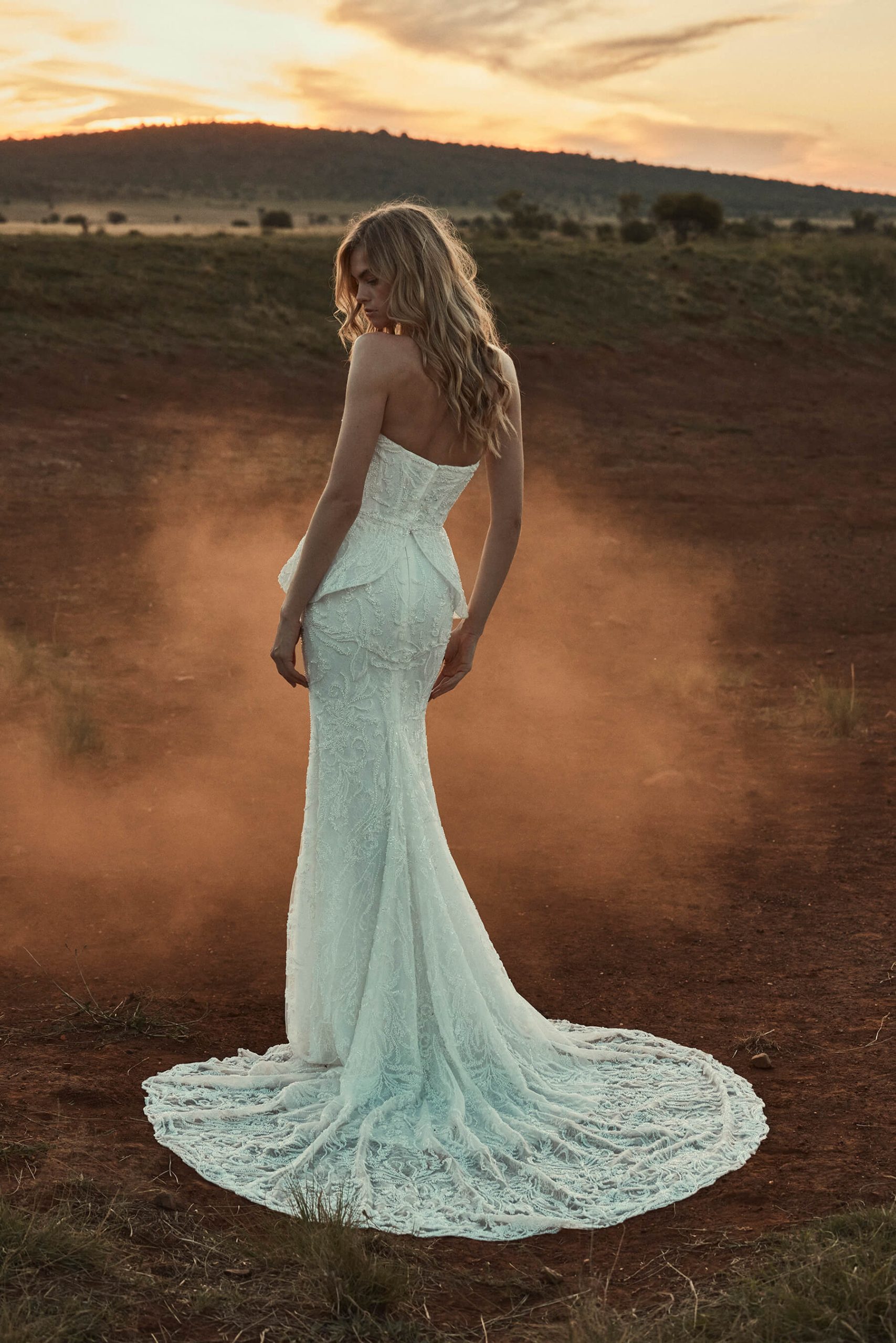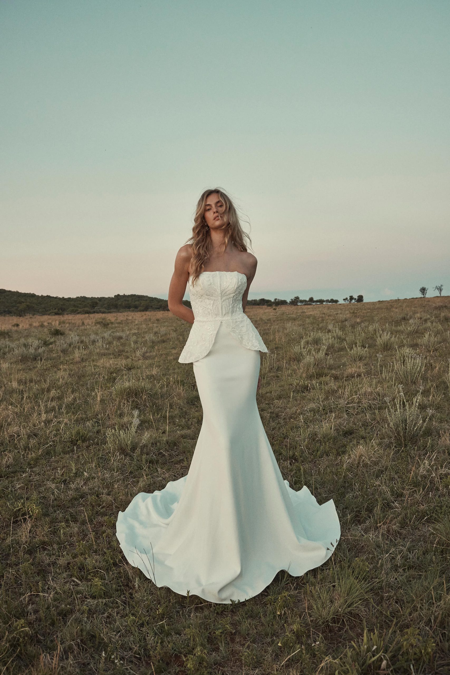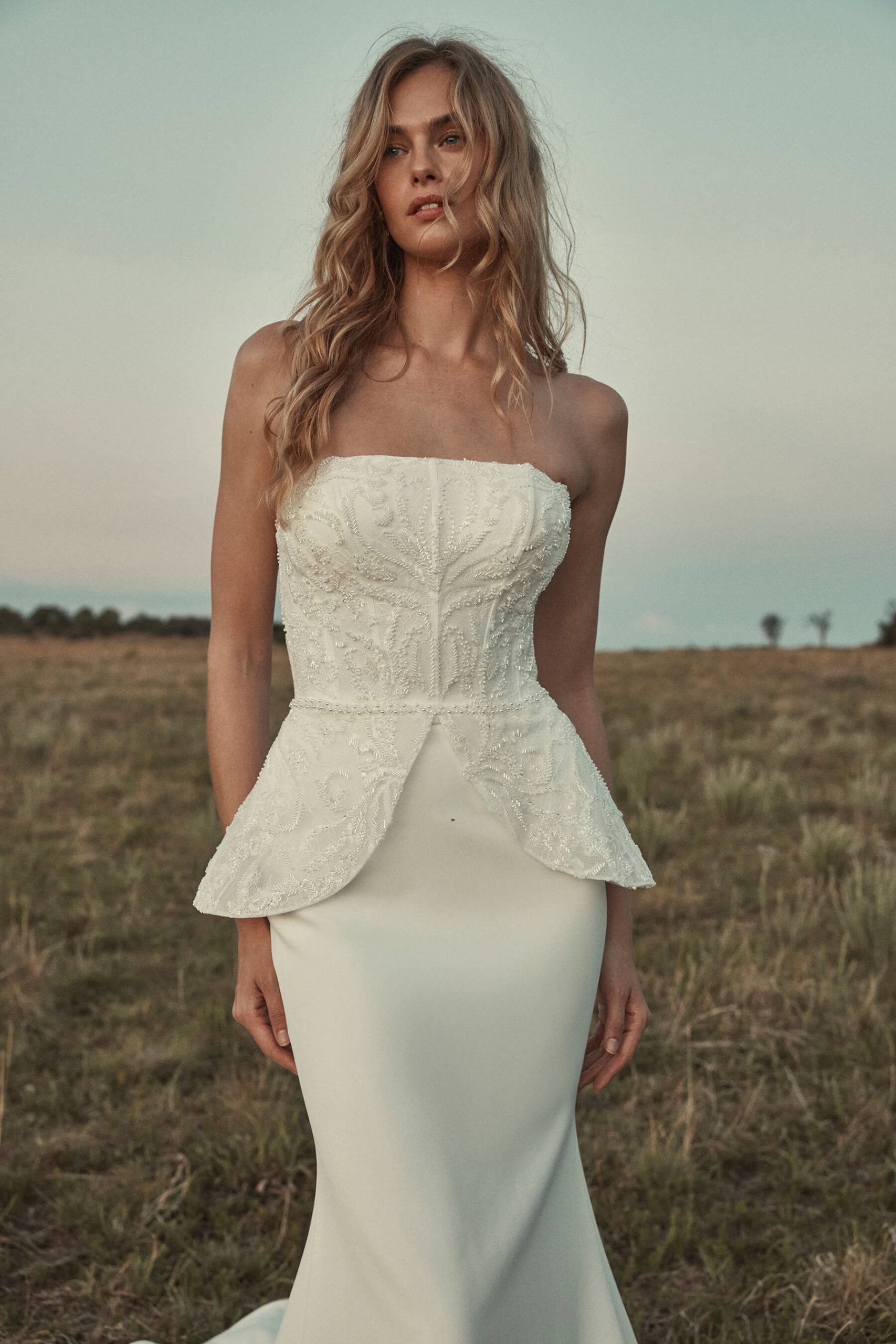 The Iria Gown is a modern two-piece masterpiece in soft ivory embellished lace. Designed with a structured strapless bodice and a graceful peplum overlay, it flatters every curve while adding a touch of architectural drama. Brides can choose between a beaded skirt for luminous texture or a sleek crepe skirt for understated sophistication. Effortlessly versatile, Iria transitions from ceremony to celebration with timeless refinement and ease.