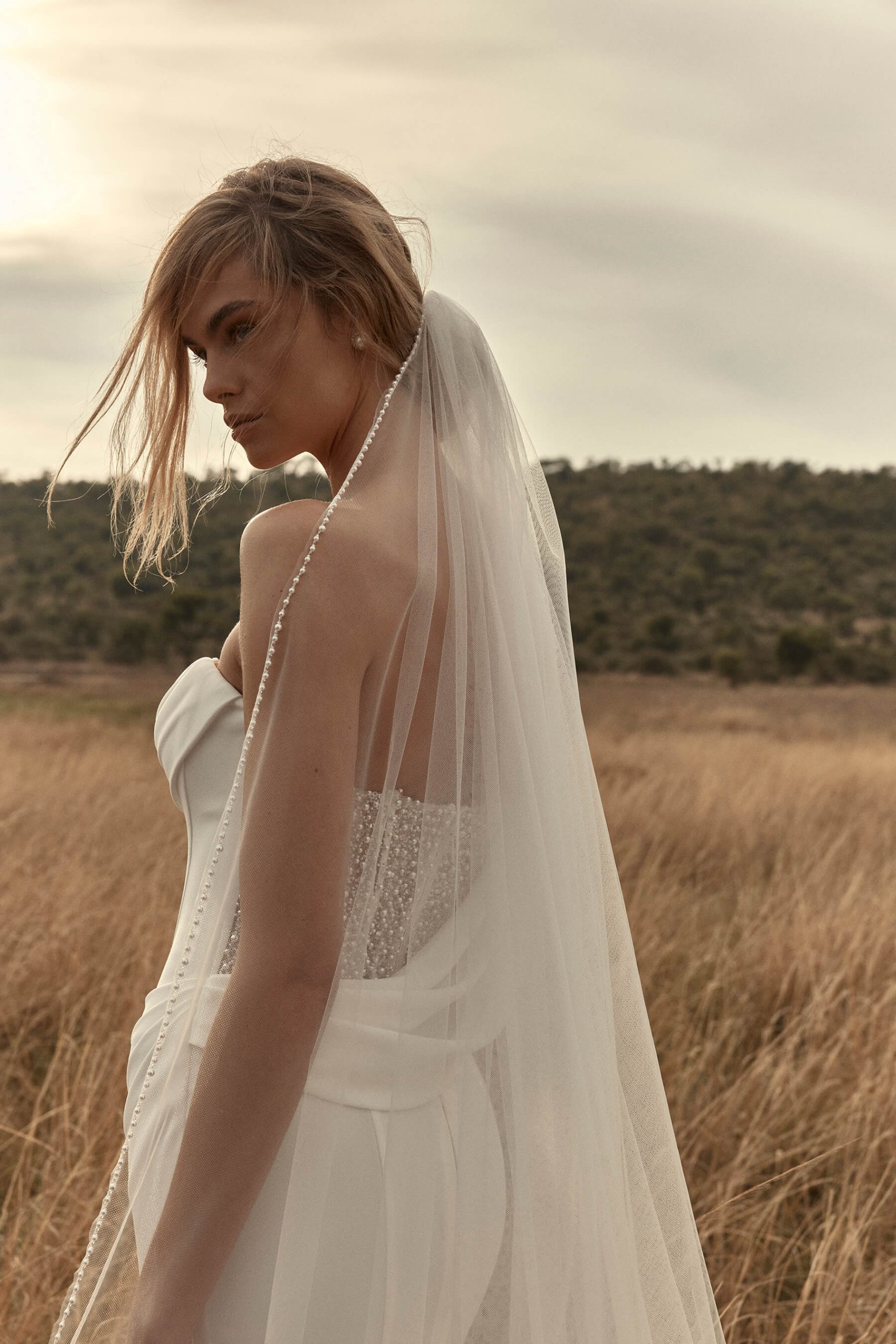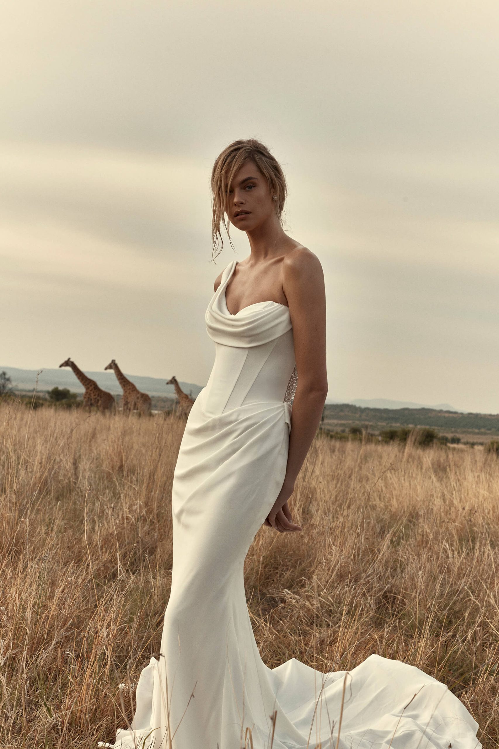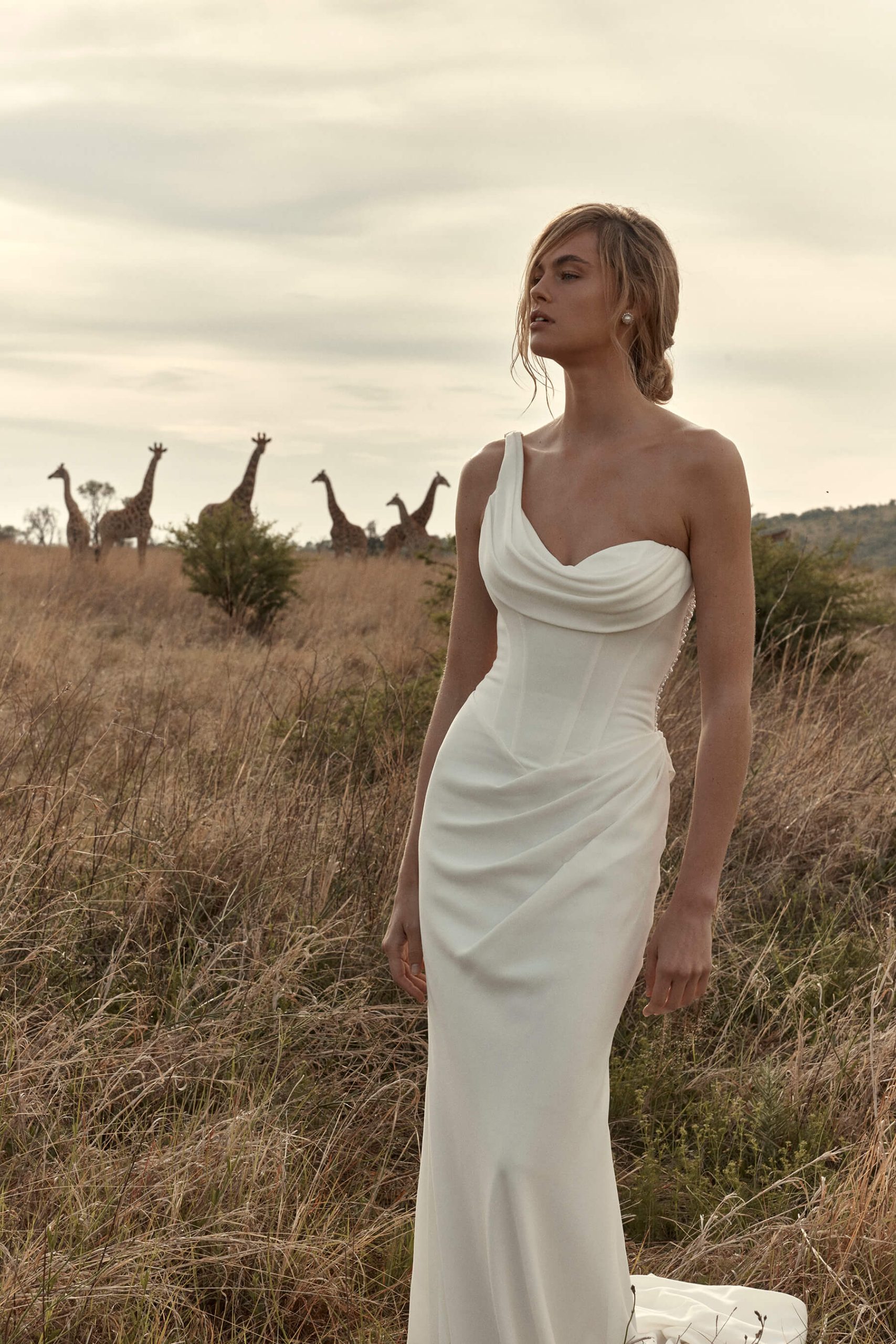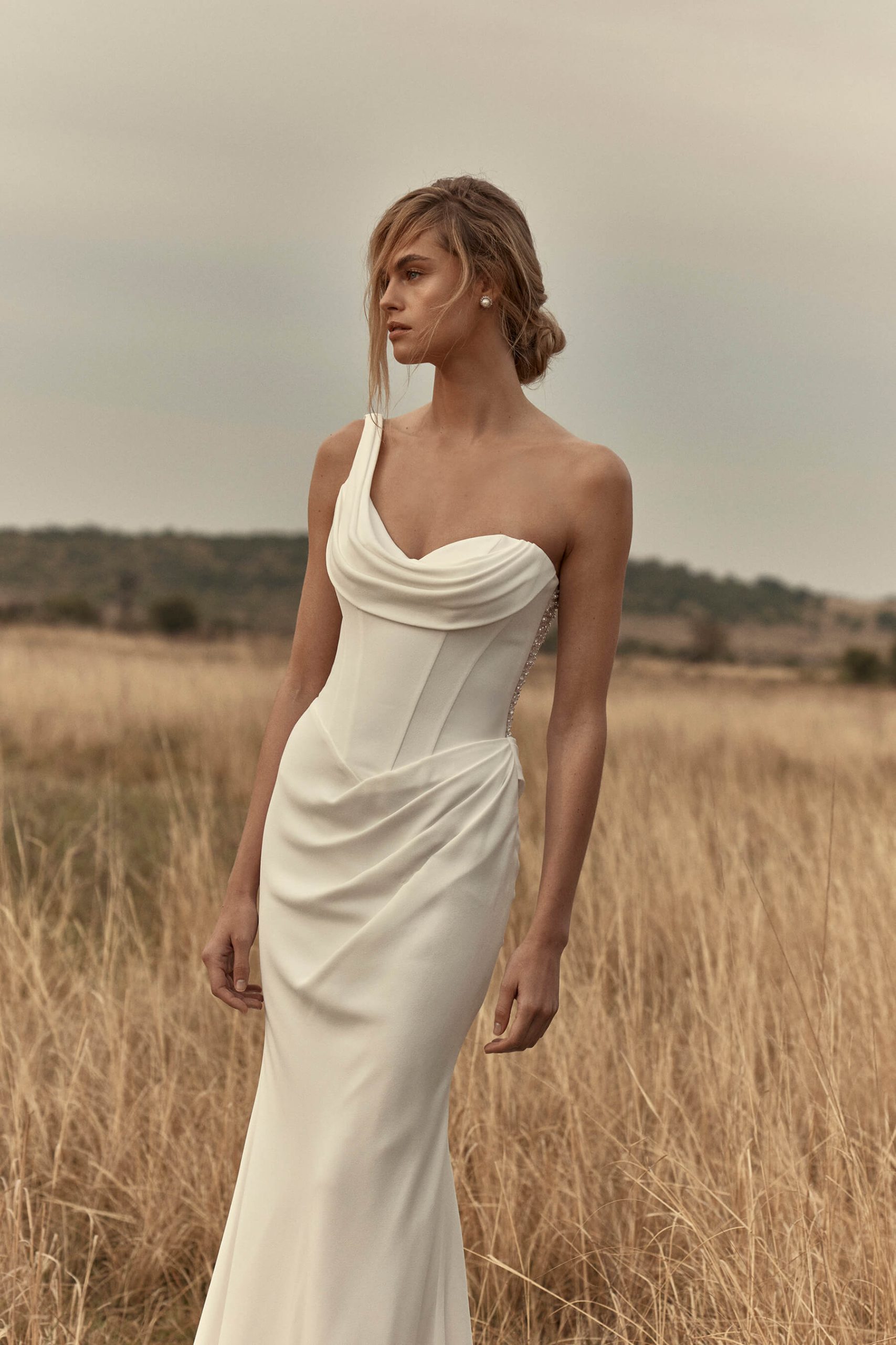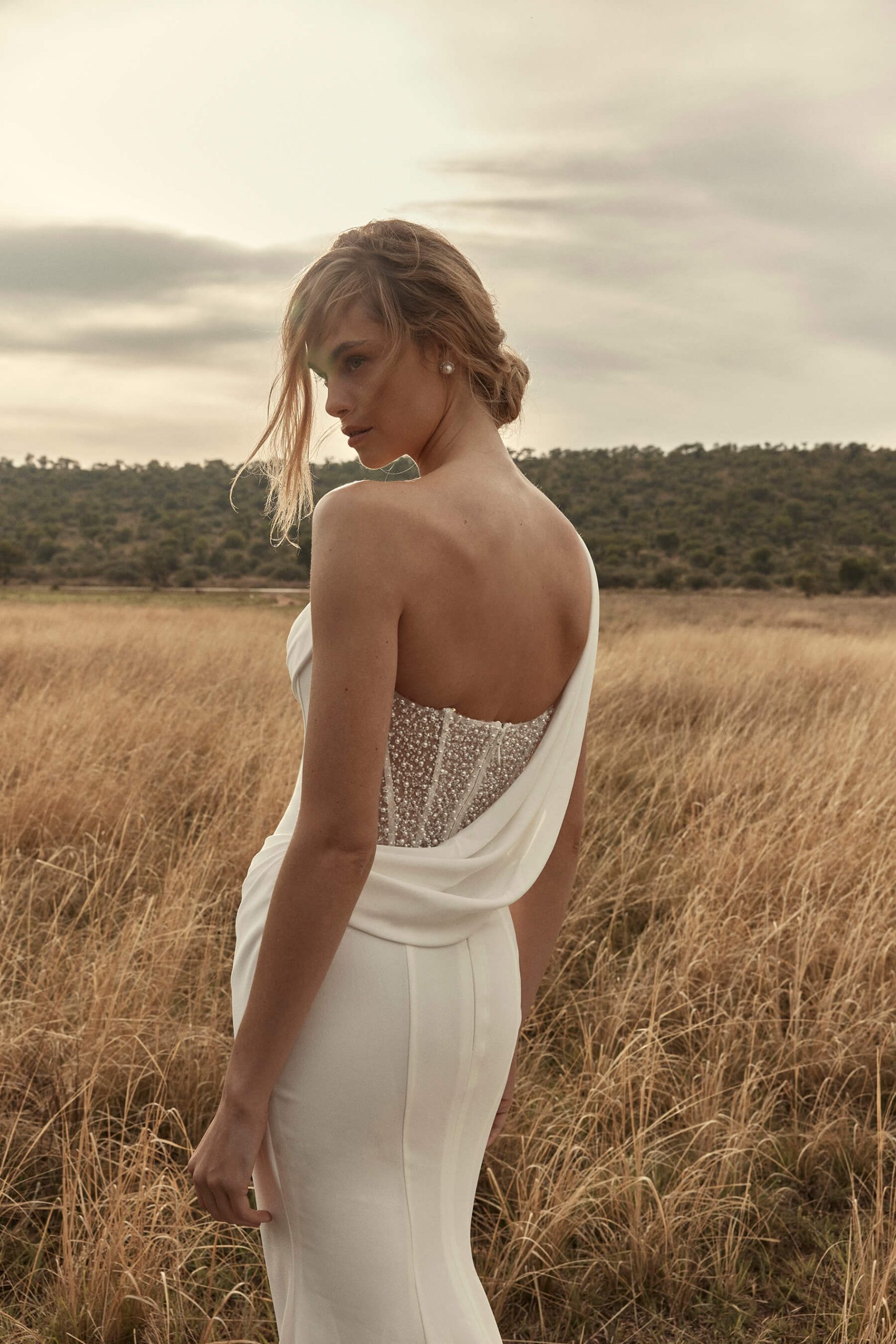 The Isola I Gown is a striking one-shoulder creation in luxurious crepe, draped gracefully to contour the body. Featuring exposed boning for a structured, corset-inspired fit and delicate draping around the hips, this gown celebrates the female form with timeless confidence. The back reveals exquisite embellished detailing, adding a touch of allure to its clean silhouette. Available in ivory or black, it is the epitome of modern sophistication and quiet power.