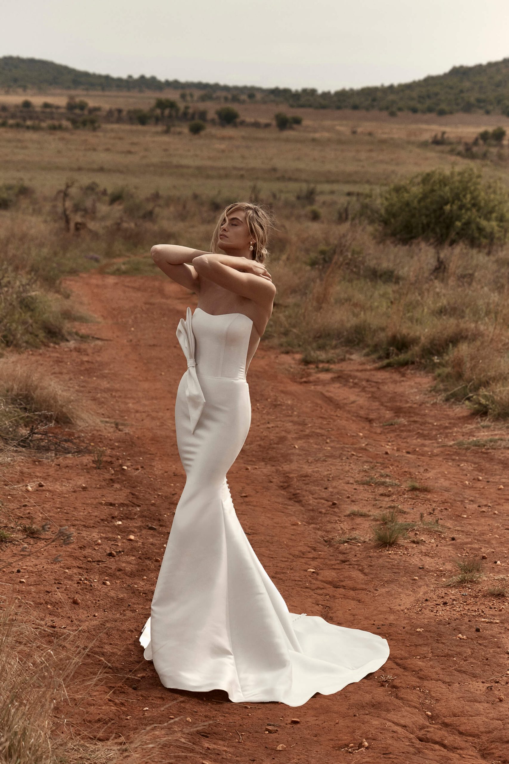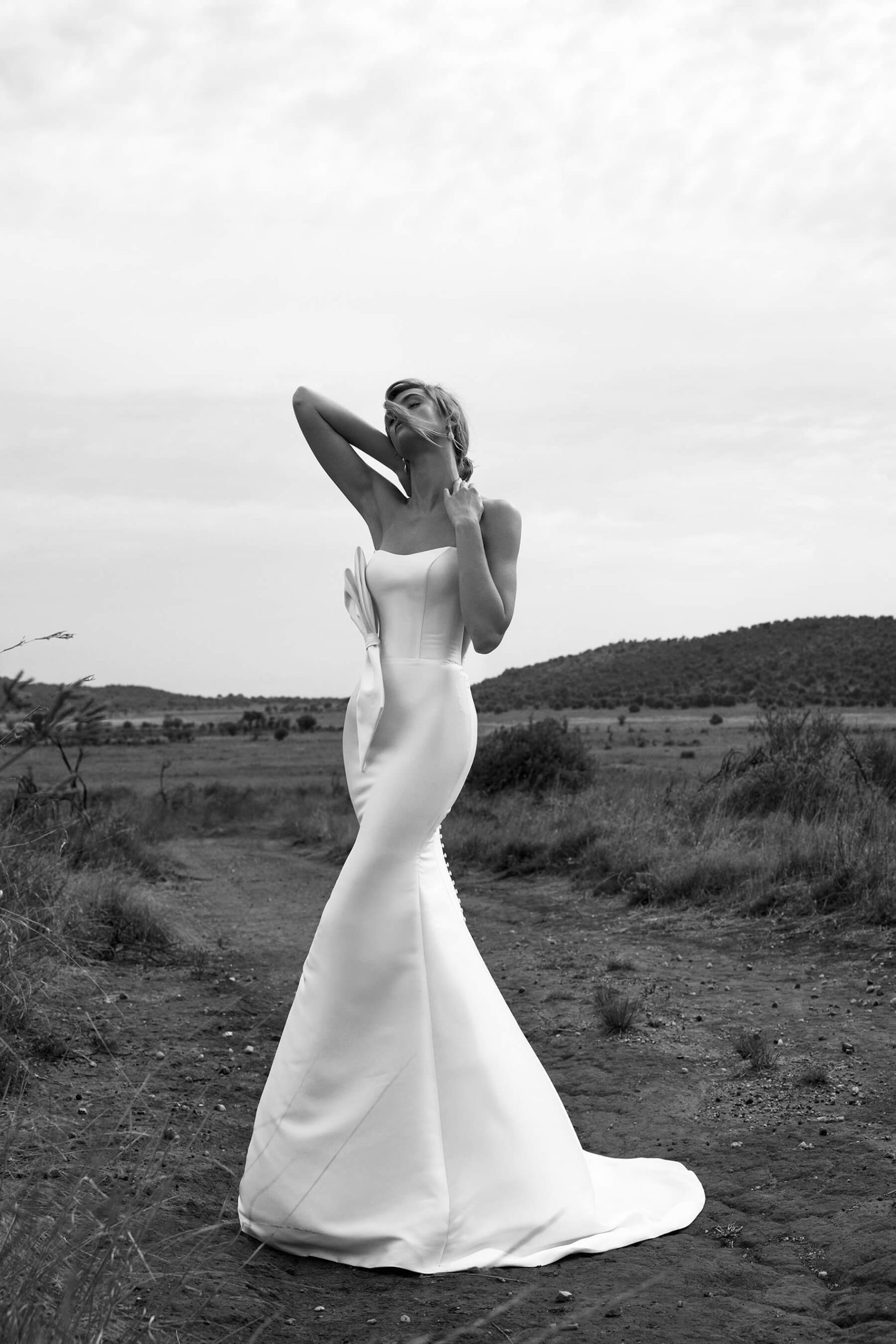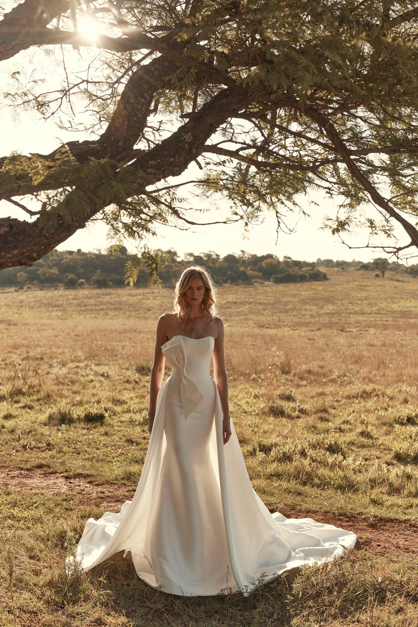 The Noorah Gown is crafted in luminous Mikado, blending structure and fluidity with effortless grace. A sculpted strapless bodice with V-side cut-outs meets a detachable overskirt and bow detail, creating an instantly transformative silhouette. Covered buttons trail elegantly to the hem, adding a couture finish. Complete the look with the matching pearl veil , the perfect harmony of modern sophistication and classic bridal romance.