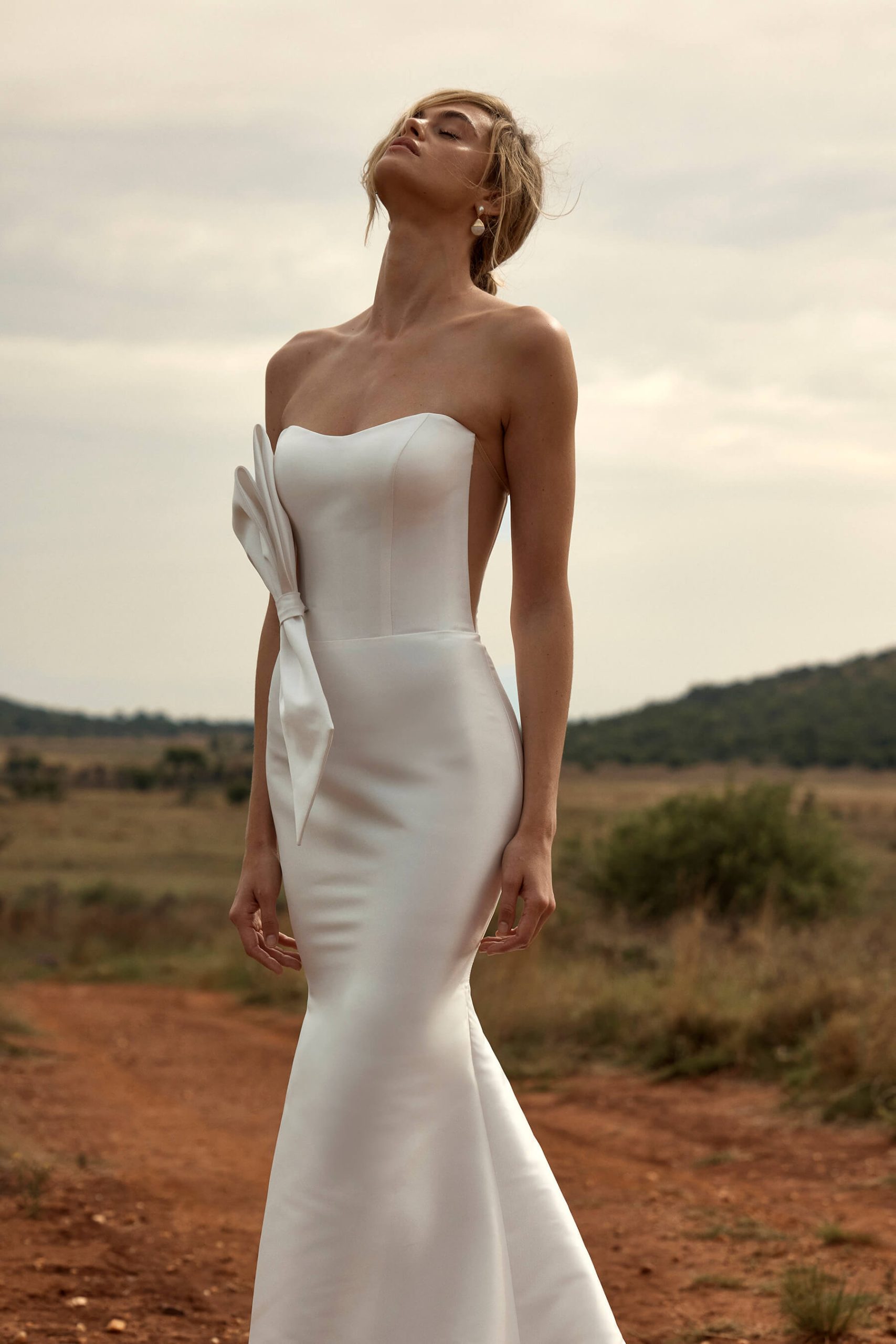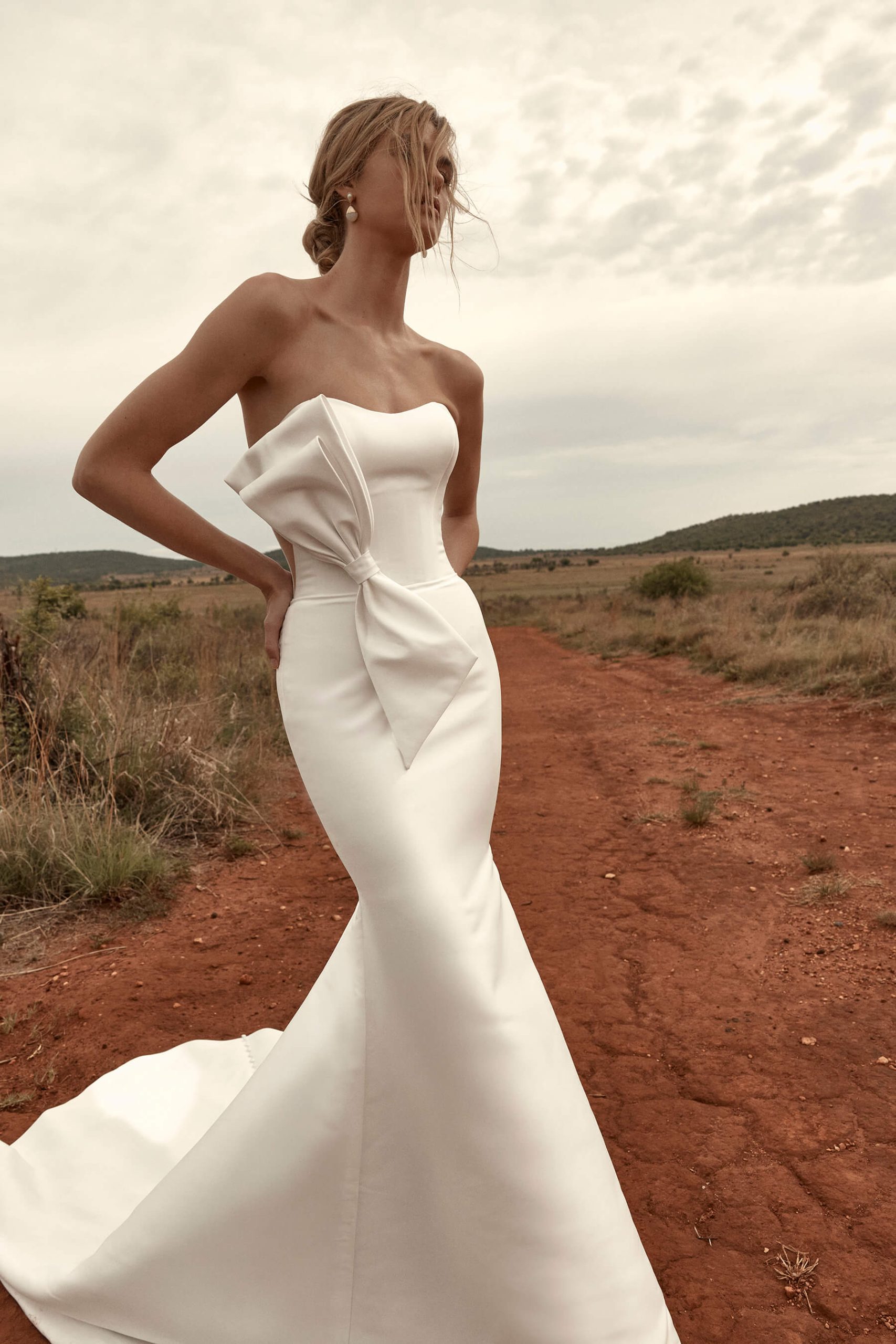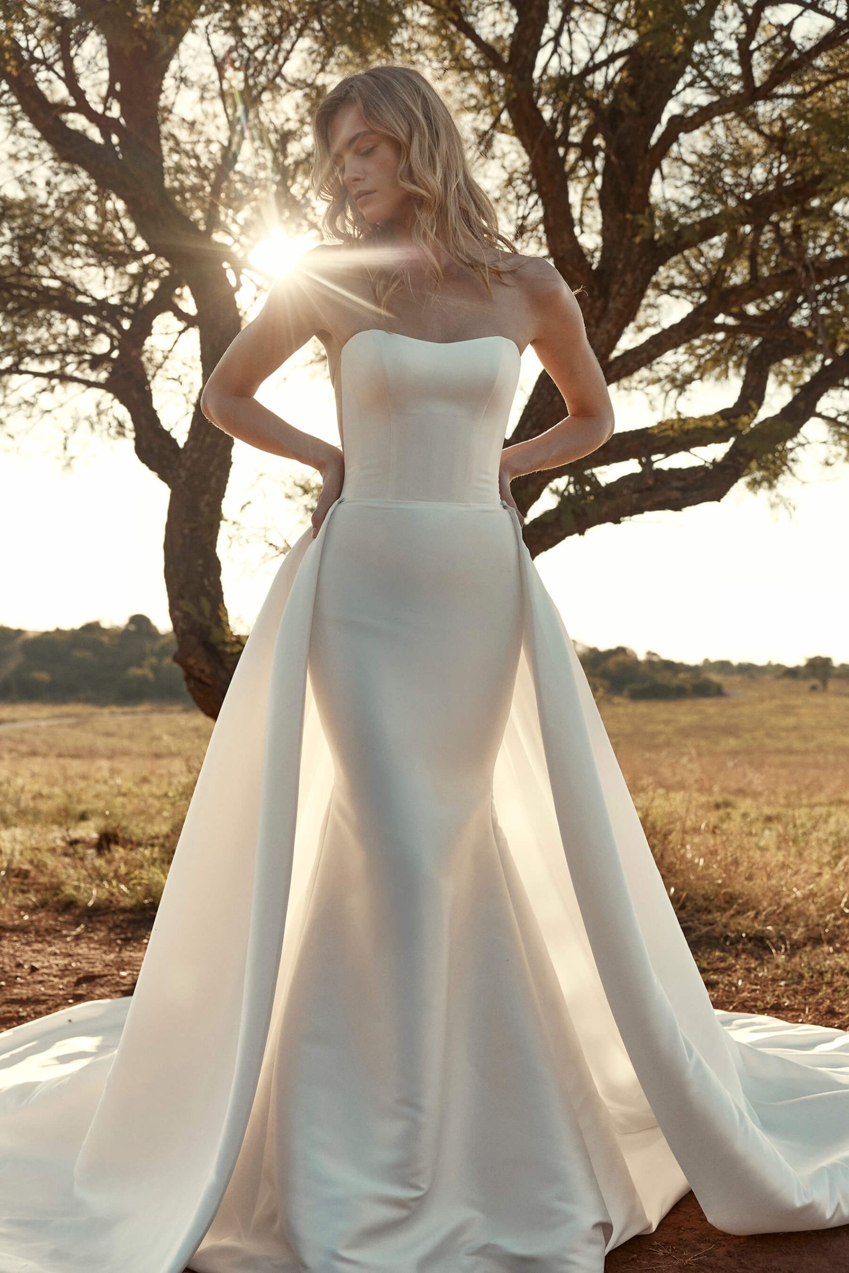 The Noorah Gown is crafted in luminous Mikado, blending structure and fluidity with effortless grace. A sculpted strapless bodice with V-side cut-outs meets a detachable overskirt and bow detail, creating an instantly transformative silhouette. Covered buttons trail elegantly to the hem, adding a couture finish. Complete the look with the matching pearl veil , the perfect harmony of modern sophistication and classic bridal romance.